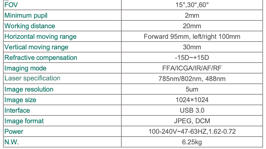 • Multi-optional imaging modes: FFA/ICGA/IR/RF/AF