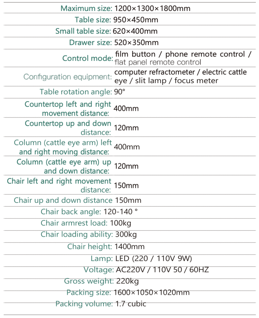 • An automatic and full functional Chair & Stand Unit, automatic functions are realized in different parts: automatic table moving, automatic tableboard up and down, automatic column up and down, automatic phoropter arm.