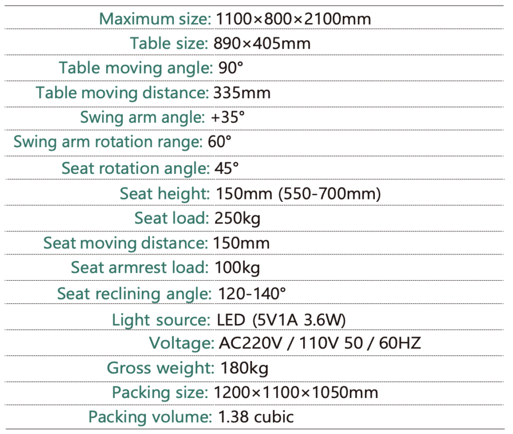 - The seat has functions of rotation, aerodynamic reclining, movement, and electric lifting;