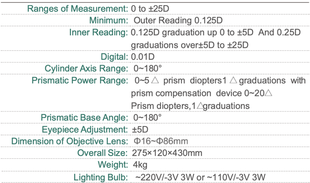 • Outer reading, ±25D measurement